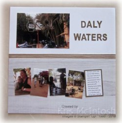 I’m back on track to share a Memory Keeping page on Saturdays. I didn’t quite follow the plan over the last couple of weeks as I had so many Christmas projects to share with you. Today’s page was created to remember our quick stop at Daly Waters on our way from the Devils Marbles to Katherine. This town is just off the highway and has an airfield which was used in WWII and a great little pub with a caravan park attached. We stopped in an had a quick look around town and a drink at the pub. Oh My Goodness what a lot of memorabilia this pub holds. It also has a great beer garden with a stage and during the peak season they have lots of entertainment.