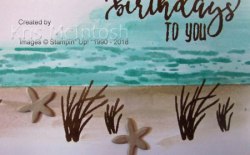 I removed the post-it-notes and stamped “happiest of birthdays to you” from the Picture Perfect Birthday stamp set using Soft Suede ink onto the top right hand corner of the card. I stamped the double grassy image from the High Tide stamp set across the sand using Soft Suede ink. I cut Crumb Cake card using the sand dollar image from the Under the Sea Framelits three times and attached the “starfish” images to the card front. I attached a piece of Brights 6″ x 6″ Designer Series Paper behind the bottom of the stamped panel. The whole piece is attached to scored and folded Thick Whisper White card.