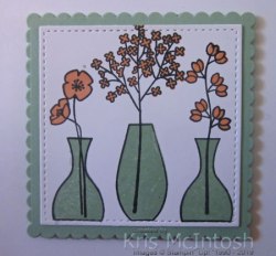 The images are cut out using one of the squares from the Stitched Shapes Framelits Dies. I attached the image panel to a Mint Macaron Scalloped Square, cut using the Layering Squares Framelits Dies. I stamped the greeting from the Varied Vases stamp set onto Whisper White card using Mint Macaron ink. The stamped card is attached to scored and folded Mint Macaron card. I attached the image panel to the card front using dimensionals.