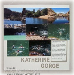 Today I am going to share with you a couple of very simple Memory Keeping pages. I know that when I first started to create pages, it took me ages to add the photos, embellishments and ribbons etc. I would spend anything up to a week, moving the pieces and adding and taking away embellishments. I finally realised that it’s the photos that are the star of the page not what you add. Sometimes, you need to add something in the way of an embellishment but not always. Today’s pages do not have any embellishments as the photos speak for themselves. The first page is of the cruise through Katherine Gorge we took on our trip to Darwin. The scenery is just so beautiful I didn’t think it needed anything more than a little information about where we were and what we did, and the date, of course. I love the photos of the family swimming in the gorge. A never to be forgotten experience. I placed my photos (all 4″ x 3″) onto a Very Vanilla 12″ x 12″ page. I cut the title from Crumb Cake card using the Little Letters Thinlits Dies (retired, but I find these dies are so often just the right size for my memory keeping). The journaling was created on my computer and printed onto Very Vanilla card which is attached to Crumb Cake card before being attached to the page.