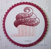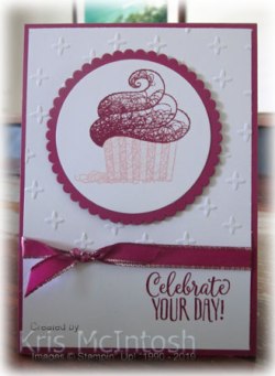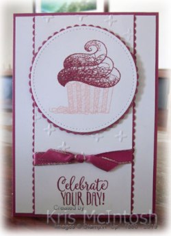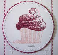 The embossed panel is attached to scored and folded Berry Burst card. I stamped the cupcake using Petal Pink and Berry Burst ink and cut it out using one of the circles from the Layering Circles Framelits Dies.