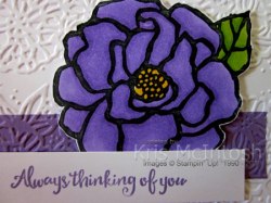 This kind of “welds” the cards together and creates a unique look. The panel is attached to scored and folded Highland Heather card. I attached the flower which is coloured using the Highland Heather and Granny Apple Green Stampin’ Blends to the card front using dimensionals. I stamped the greeting from the Beautiful Day stamp set onto Whisper White card using Highland Heather ink and attached it to the card front, partially over the flower, using dimensionals.