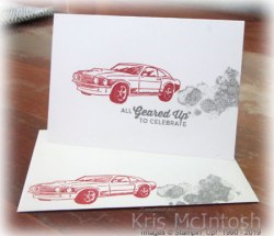 The second card is slightly stepped up and would suit someone who stamps to create cards for their family and close friends. This time I stamped the smoke image onto Whisper White card using Basic Gray ink which I had stamped off once. I also stamped the greeting from the Geared Up Garage stamp set using Basic Gray ink. The stamped Whisper White card is attached to scored and folded Basic Gray card.