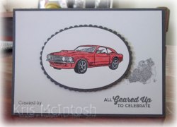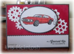 Have you seen this gorgeous guy suite in the Occasions Catalogue. It has a stamp set, dies, designer series paper and some embellishments. Such fun. Today I have three cards to share with you. The first one is simple stamping. I stamped the smoke image from the Geared Up Garage stamp set onto a Note card using Basic Gray ink which I stamped onto scrap paper first. I stamped the car image from the same stamp set using Real Red ink.