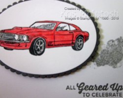 I stamped the car image from the Geared Up Garage stamp set onto Whisper White card using Memento Tuxedo Black ink and coloured it using the Dark Real Red Stampin’ Blend and the Light Smoky Slate Stampin’ Blend. I stamped the smoke image behind the car using Basic Gray ink, which I had stamped onto scrap paper first. The image is cut out using one of the Layering Oval Framelit Dies and attached to a Basic Gray scalloped oval cut using the same dies.