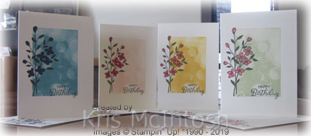 I saw a card on Pinterest (sorry I can’t find it now, let me know if it is yours) which I thought was pretty and decided to take the idea and use it to create a quick set of Very Vanilla Note cards. I used several different colours, however this first one uses Bermuda Bay to stamp the Bokeh Dots background image. I set up all the stamped images on the Stamparatus because I knew I wanted to make more than one card. I stamped the image from the Timeless Textures stamp set over the left hand edge of the background using Memento Tuxedo Black ink. I stamped the greeting from the Beautiful Bouquet stamp set using Memento Tuxedo Black ink. I coloured the flower using the Dark Night of Navy and Dark Old Olive Stampin’ Blends.