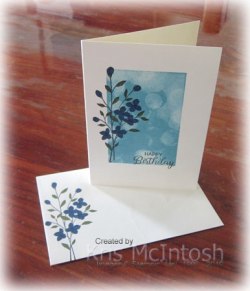 The second Note card has the background stamped in Petal Pink with the image coloured using the Dark Real Red and Dark Old Olive Stampin’ Blends. Again the envelope has the flower stamped and coloured using the same Stampin’ Blends.