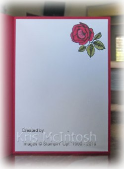 As I said I coloured several flowers in the one sitting. The second card uses Cherry Cobbler card for the card base and the larger rectangle. The flower is coloured using Cherry Cobbler and Old Olive Stampin’ Blends. The Buffalo Check is stamped in Old Olive ink and the background in Smoky Slate ink. The smaller flower is also used to decorate the inside of the card.