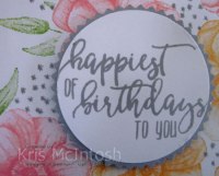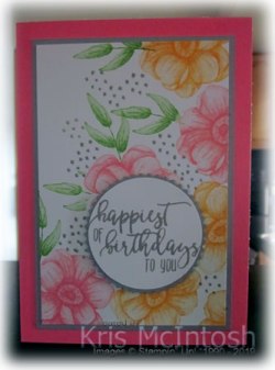 I stamped the leaves using Granny Apple Green ink. Donna stamps her leaves without it, but I used a post-it-note mask to cover the flowers before stamping. I added the small “dotty” image using Gray Granite ink. The stamped panel is attached to Gray Granite card and then scored and folded Flirty Flamingo card. I stamped the greeting from the Picture Perfect Birthday stamp set onto Whisper White card using Gray Granite ink. I punched out the greeting using the 2″ Circle Punch and attached it to Gray Granite card punched using the Starburst Punch. The greeting is attached to the card front using dimensionals.