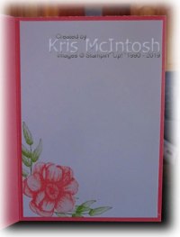 To decorate the inside of the card, I stamped the flower using Flirty Flamingo ink onto the lower left hand corner of Whisper White card. I masked the flower and stamped the leaf image using Granny Apple Green ink.