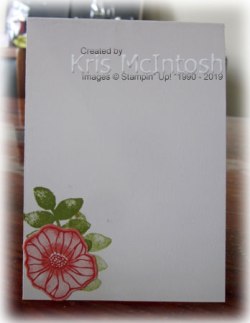 This time using the Oh So Eclectic stamp set from the Annual Catalogue.  I cut Calypso Coral card using the Rectangle Stitched Shapes Dies and attached it to scored and folded Thick Whisper White card.  I cut Whisper White card using a slightly smaller Rectangle Stitched Framelits Die and at the same time using the die from the Eclectic Layers Thinlits Dies inside the rectangle shape.  The Whisper White card is attached to the centre of the Calypso Coral card.  I stamped the greeting from the Itty Bitty Greetings stamp set using Pear Pizzazz ink onto the lower right hand corner of the card front.  I stamped the leaf from the Oh So Eclectic stamp set three times onto Whisper White card using Pear Pizzazz ink.  The leaves are cut out using the co-ordinating die from the Eclectic Layers Thinlits Dies.  I stamped the small flower head onto Whisper White card three times using Calypso Coral ink.  I cut out the flowers using the co-ordinating die from the Eclectic Layers Thinlits Dies.  I also cut the complete detailed flower from Calypso Coral card.  The flower head image is attached to the back of the detailed flower.  I attached the leaves and two of the flowers to the card front using liquid glue.  I attached the third flower using dimensionals underneath the flower head and liquid glue on the stem.  I used the Calypso Coral Stampin’ Write Marker to colour the Whisper White 1/8″ Sheer Ribbon.  I let the ribbon dry and tied a bow which is attached over the flower stems using a glue dot.
