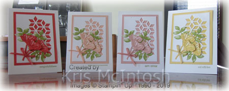 The remaining cards are created using Blushing Bride, Petal Pink and So Saffron ink and card.  The ribbon is coloured in the same manner as for the first card using the co-ordinating Stampin’ Write Marker.