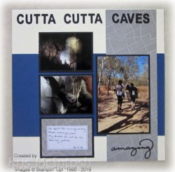 While we were staying in Katherine, we took the opportunity to tour the Cutta Cutta Caves. These caves are amazing and so beautiful. The formations are all crystalised and they are very sparkly, not that my photos show that! To get there you walk through some very unremarkable bushland to reach the stairs that descend into the cave. Apparently during WWII the soldiers from nearby camps would come down into the cave to be cool and relax – there wasn’t much else to do on your time off. This page is created on Very Vanilla 12″ x 12″ card. I attached one piece of Best Route Designer Series Paper across the page and one piece of the same Designer Series Paper down the right hand side. The photos are attached to Basic Black card and so is the Best Route 4″ x 3″ Memories and More card. I hand wrote my journaling this time (apparently you are supposed to do this to preserve it for your descendents – not sure mine is worth preserving!). The title is cut from Basic Black card using the retired Timeless Type Thinlits Dies. I used the Celebrate You Thinlits to cut out “amazing” from Basic Black card as well.