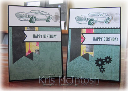 Instead of adding a strip of Basic Black card, I cut the Basic Black card using the border die from the Be Mine Stitched Framelits Dies. The car is stamped onto scrap Whisper White card, cut out using the Garage Gears Thinlits Dies and attached to the card front using dimensionals. I also cut the three cog die from Basic Black card and attached it to the card front.