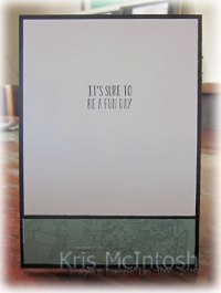I am one of those card makers who would rather do a flowery female card than one designed for males. I have to work really hard to do them. Today I worked on using the Geared Up Garage stamp set and some of the co-ordinating Designer Series Paper. For the first card I stamped the car image from the Geared Up Garage stamp set oto the top of Whisper White card using Tranquil Tide ink. I stamped the “smoke” image from the same stamp set behind the car using Basic Gray ink which I had stamped off onto scrap paper first. I attached a narrow strip of basic black behind one edge of a piece of the Classic Garage 6″ x 6″ Designer Series Paper before attaching the panel to the bottom of the stamped card.