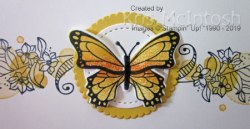I stamped the butterflies from the Butterfly Gala stamp set onto Whisper White card using Memento Tuxedo Black ink. I inked the fill images using the Pumpkin Pie/Daffodil Delight of my Spectrum Pad. (Please visit Patty Bennett’s blog to see how to ink your Spectrum Pad.) The butterflies were punched out using the Butterfly Duet Punch. I curled the butterfly wings on the larger butterfly using my bone folder and attached it to the centre of the Whisper White circle using a glue dot in the centre of the body and mini dimensionals under each wing. Once attached I stamped the antennae image using Memento Tuxedo Black ink.