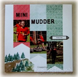 I have already shared the pages I made for Jae’s brother and sister for last year’s Mini Mudder and thought it about time to share Jae’s run. I used the gorgeous Painted Seasons Designer Series Paper which is one of the items you can earn for Free with a qualifying order during Sale-a-Bration. I cut strips of three different designs from the Designer Series Paper and hand cut a “v” into one end of each piece before attaching them to 12″ x 12″ Whisper White card. I attached the photos over the designer series paper. To decorate the left hand corner I stamped the double tree image from the Rooted in Nature stamp set using Shaded Spruce ink.