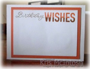 I attached the last frog over the small flap on the right and side making sure that the end of the twine is attached behind his outstretched hand. I cut Whisper White card using the second largest of the rectangles from the Rectangle Stitched Framelits. I stamped Wishes from the More than Words stamp set using Grapefruit Grove onto the top right hand corner. I added the detail to the wishes using Crumb Cake ink. I also stamped “birthday” from the same stamp set using Crumb Cake ink. The Whisper White rectangle is attached to a Grapefruit Grove rectangle cut using the largest die from the Rectangle Stitched Framelits Dies. The panel is attached to the back of the card to give me somewhere to write my message.