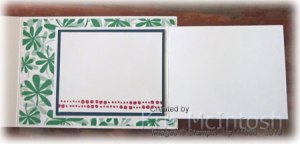 I cut the two card bases from Thick Whisper White card. I used a piece of Happiness Blooms Designer Series paper to decorate the inside of the base card and the reverse side of the same Designer Series paper to decorate the small fold on the left. To decorate the front of the smaller folding card, I stamped the small flower stem from the Bloom by Bloom stamp set three times onto Whisper White card using Call Me Clover ink.