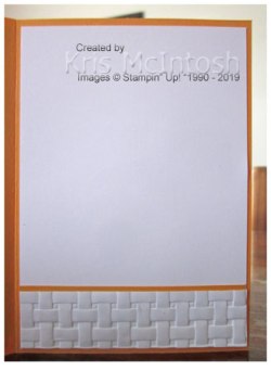 To decorate the inside of the card, I attached a narrow strip of Mango Melody card behind one long edge of Whisper White card which is embossed using the Basket Weave Dynamic Embossing Folder.