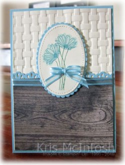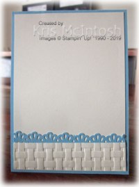 I was happy to see that the Daisy Delight stamp set will be in the next Annual Catalogue and that there will be a co-ordinating stamp set and another, slightly smaller, daisy punch. Woohoo! Anyway I am combining my determination to use up my Designer Series Paper with my passion to use stamp sets that have been a little neglected. This set of cards is one of my first results. I embossed Very Vanilla card using the Basket Weave Dynamic Embossing Folder. I punched a narrow strip of Balmy Blue card using the Decorative Ribbon Border Punch and attached it behind one long edge of Wood Textures Designer Series Paper.