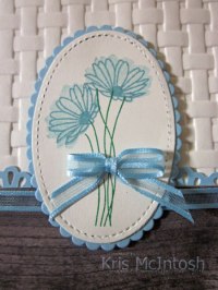 I wrapped the top of the Designer Series paper with a piece of the Balmy Blue Organdy Ribbon (free during Sale-a-Bration) and attached the panel to the bottom of the embossed Very Vanilla card. The whole panel is attached to scored and folded Balmy Blue card. I stamped the stem image from the Daisy Delight stamp set using Call Me Clover ink. I stamped the solid image for the flower using Balmy Blue ink which I stamped onto scrap paper first.