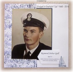 Something new! Today’s page shows off a photo of my Dad taken when he first joined the Navy at the age of 21. My Dad always wanted to go to sea and tried to join the Merchant Navy when he was 16 but his parents wouldn’t sign the papers for him to join. So he got an apprenticeship and as soon as he turned 21 he joined the Navy. I have used Whisper White 12″ x 12″ card as the base for my page. I attached a 6″ strip of Tranquil Textures Designer Series Paper to the left hand side . I attached the photo to Night of Navy card and slipped the Night of Navy card under the Designer Series Paper to offset the photo.