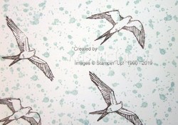 I stamped the background from the stamp set included in the Paper Pumpkin kit onto the top right and bottom left hand corners pf a Very Vanilla 12″ x 12″ card using Balmy Blue ink. I stamped several of the bird images from the same stamp set over the top using Early Espresso ink. I used removable adhesive to attach Very Vanilla card (for my journaling) to Balmy Blue card and then attached it to the page.