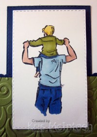 I cut out the image using the Rectangle Stitched Dies. I also cut a Rectangle Stitched Die from Night of Navy card. I embossed a piece of Old Olive card using the Curls and Swirls Embossing Folder. I stamped the greeting from the A Good Man stamp set onto the lower right hand corner of Whisper White card using Night of Navy ink.