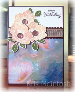 I made the card I am sharing with you today for my youngest daughter who celebrated her birthday yesterday. Happy Birthday Emma. I attached a piece of Perennial Essence Designer Series Paper to Whisper White card. I stamped the greeting from the Beautiful Bouquet stamp set onto the upper right hand corner using Blackberry Bliss ink. I cut both edges of a strip of Blackberry Bliss card using the edgelit die from the Stitched Be Mine Dies. I attached the die cut piece over the top edge of the Designer Series Paper and wrapped the panel with the Petal Pink 5/8″ Organdy Striped Ribbon before attaching to scored and folded Blackberry Bliss card.