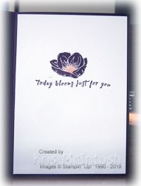 To decorate the inside of the card, I stamped the smaller of the flower images onto Whisper White card using Blackberry Bliss ink. I stamped the flower centre using Petal Pink ink. I stamped the greeting from the Perennial Birthday stamp set below the flower using Blackberry Bliss ink.