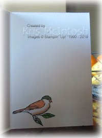 To decorate the inside of the card, I stamped the large bird and the leaf image from the Free As A Bird stamp set onto Whisper White card using Memento Tuxedo Black ink. I coloured the image using the same Stampin’ Blends as the image on the front of the card. I fussy cut the images and attached them to the lower left hand corner.