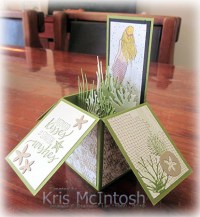 I have been working my way through a series of fancy fold cards and today’s card is one of those. This card is called a Pop Up Box Card and will fit into a standard envelope. My base card is Old Olive. I created the tall image panel by stamping the mermaid image from the Magical Mermaid stamp set onto Whisper White card using Memento Tuxedo Black ink. I masked the image and stamped the seaweed image from the same stamp set across the bottom of the Whisper White card using Soft Sea Foam ink. I stamped the single seaweed image from the Sea of Textures stamp set across the bottom of the card using Old Olive ink.