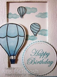 I attached the two small balloons over the stamped clouds and the large balloon to the left hand side of the card front, partially over the frame using dimensionals. I stamped “happy birthday” from the Magnolia Blooms stamp set onto Whisper White card using Balmy Blue ink and cut it out using one of the circles from the Stitched Shapes Dies. I attached the greeting to a Balmy Blue scalloped circle cut using the Layering Circles Dies and then the card front, partially over the frame using dimensionals.