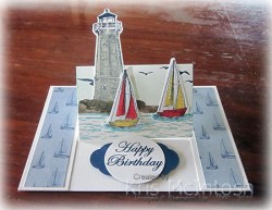I stamped the sea image from the High Tide stamp set across the bottom of the central panel using Balmy Blue ink. I stamped the long skinny image from the Waterfront stamp set across the top of the water using Soft Suede ink. I made sure to line up the edge of the stamp the the left hand edge of the central panel. I sponged the rest of the central panel with Pool Party ink and stamped the bird image from the High Tide stamp set over the sponged area using Night of Navy ink. I stamped the lighthouse from the Sailing Home stamp set onto scrap Whisper White card using Memento Tuxedo Black ink. I added some colour using the Soft Suede and Sahara Sand Stampin’ Write Markers. I cut out the image using the co-ordinating Smooth Sailing Die and attached the lighthouse over the stamped Soft Suede image, making sure that the glue did not extend above the score line.