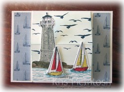Today I am sharing a Central Panel Easel Card which has a card base cut from Thick Whisper White card. To create this card, you need to cut and score your card base as usual. Line up the edge of the card with the 1-1/4″ mark on our paper trimmer and cut from the score line to the edge. Line up the opposite edge of the card with the 1-1/4″ mark and cut from the score line to the edge. You need to make sure that both cuts are on the same side of the fold. The 1-1/4″ panels are glued to the back of the card and decorated with Come Sail Away Designer Series Paper. The central flap is scored roughly in half.