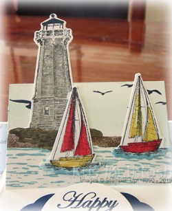I stamped the small sailing boat image from the Sailing Home stamp set onto scrap Whisper White card using Memento Tuxedo Black ink and added some colour using the Balmy Blue, Daffodil Delight and Poppy Parade Stampin’ Write Markers. The boats were cut out using the co-ordinating Smooth Sailing Die. One boat is attached to the right hand side of the stamped sea image, making sure that the glue does not go above the score line. The second boat is attached to the card using dimensionals.