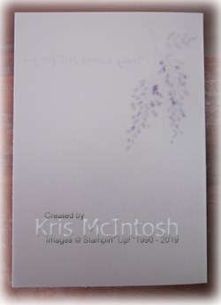 I coloured the flowers using the Dark Highland Heather Stampin’ Blend and the leaves using the Light and Dark Soft Sea Foam Stampin’ Blends. I attached the stamped card to Highland Heather card and then the card front using dimensionals.