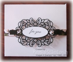 I cut the label for the front of the box from Basic Black card using the Detailed Band Dies and attached it over the ends of the Designer Series Paper. (The designer series paper piece is the left over strip when you #loveitchopit.) I stamped the greeting from the Beauty Abounds stamp set onto scrap Whisper White card and cut it out using the co-ordinating Detailed Band Die. The greeting is attached to the centre of the Basic Black label.