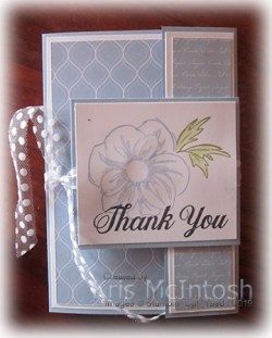 I stamped the leaf next to the flower using Old Olive ink. I used my Aqua Painter on both the flower and the leaves to add colour. I stamped “Thank You” from the Daisy Delight stamp set using Memento Tuxedo Black ink. Before I attached this panel to the small card front, I wrapped the card with the Whisper White 5/8″ Polka Dot Tulle Ribbon so I could tie a bow to keep the card shut.