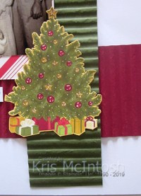 I cut the Christmas Tree image from one of the 3″ x 4″ Memories and More cards and attached it below the photo. I stamped the Santa image from the Holly Jolly Christmas stamp set onto Whisper White card using Memento Tuxedo Black ink. I coloured the image using Cherry Cobbler, Basic Black, Crumb Cake, So Saffron, Old Olive and Night of Navy Stampin’ Blends. I cut out the image using the co-ordinating Jolly Season Dies and attached it to the page. I cut “Tis the Season” from Cherry Cobbler card using the die from the Jolly Season Dies. I created my journaling on the computer, printed it onto Whisper White card and cut it into strips before attaching to the page.