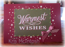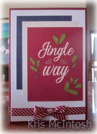 The third card also uses a 4″ x 3″ Memories and More card which is attached to one of the co-ordinating Night Before Christmas cards . I tied a tow in a length of Cherry Cobbler 3/8″ Diagonal Stripe Ribbon and attached it to the card front using a Mini Glue Dot. To decorate the inside I attached a die cut banner from the sticker sheet.