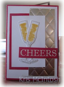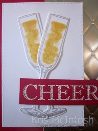 I stamped “cheers” from the Sip Sip Hooray stamp set onto Real Red card using Versamark ink. I sprinkled the image with White Embossing Powder and heat set it. The greeting is attached to the card front using dimensionals.