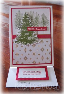The Whisper White panel is attached to Real Red card and then Thick Whisper White card. To create the easel you attach the bottom of the stamped panel to the small 7.2cm wide panel on the card base. I stamped the single tree from the Winter Woods stamp set onto scrap Whisper White card using Old Olive ink. I cut out the tree using the co-ordinating In The Woods Die and attached it to the card front using dimensionals.