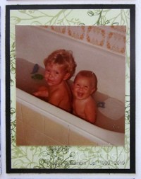 I cut the “Love This” from another 3″ x 4″ Magnolia Lane Memories and More Card and trimmed it to fit across the panel. I wrapped the panel with the White 3/8″ Linen Ribbon from the Magnolia Lane Ribbon Combo and attached it to Basic Black card. I tied a bow in another length of the Magnolia Lane White 3/8″ Linen Ribbon and attached it using a Glue Dot. The photo of the girls in the bath is attached to a 3″ x 4″ Magnolia Lane Memories and More Card and then Basic Black card.
