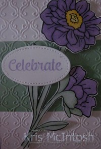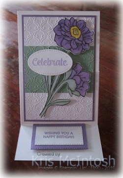I inked “celebrate” from the Band Together stamp set using a Highland Heather Stampin’ Write Marker and stamped the greeting onto Whisper White card. I cut out the greeting using one of the ovals from the Stitched Shapes Dies. The greeting is attached to the card front using dimensionals. I stamped “wishing you a happy birthday” from the Band Together stamp set onto scrap Whisper White card and cut it out using the Stitched Rectangle Dies. The greeting is attached to one size larger stitched rectangle cut from Highland Heather card before being attached to the inside of the card base using dimensionals.