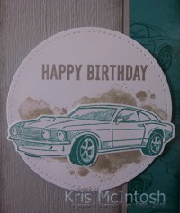 I stamped the “smoke” image from the Geared up Garage stamp set several times below the greeting using Sahara Sand ink. I attached the stamped circle to the card front using dimensionals. I stamped the car image from the Geared Up Garage stamp set onto scrap Whisper White card and cut it out using the co-ordinating Garage Gears Die.