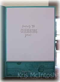 To decorate the inside of the card, I stamped the greeting from the Perennial Birthday stamp set onto Whisper White card using Smoky Slate ink. I stamped the car image from the Geared Up Garage stamp set randomly onto Bermuda Bay card using Bermuda Bay ink. I sponged the edges of the stamped card using Bermuda Bay ink and attached a narrow strip of Smoky Slate card behind one long edge. The stamped panel is attached to the bottom of the stamped Whisper White card.