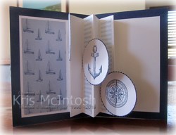 I created the concertina for the inside of the card following Elizabeth’s instructions. I added a few panels of Sail Away Designer Series Paper before attaching the concertina to the inside of the card. I stamped the small sailing boat, anchor and compass images from the Sailing Home stamp set onto Whisper White card using Night of Navy ink. I cut out the images using one of the circles from the Layering Circles Dies. Each circle is attached to a Night of Navy scalloped circle cut using the same dies. Each image is attached to one of the concertina panels, making sure to stagger them evenly. The panel on the right is left blank to allow somewhere to write a message.