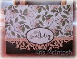 Today’s card is a really quick and simple card. I love the Magnolia Lane Designer Series Paper and it is so beautiful it doesn’t need much embellishment. So I decided to make it the star of the card. I cut Petal Pink card using the Delicate Lace Die and attached it behind one long edge of the Magnolia Lane Designer Series Paper. The panel is attached to scored and folded Early Espresso card.